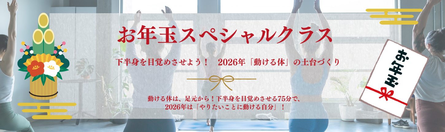 このお年玉スペシャルクラスではみなさんの下半身にスイッチオンし、上半身がより楽に使える体を目指します。