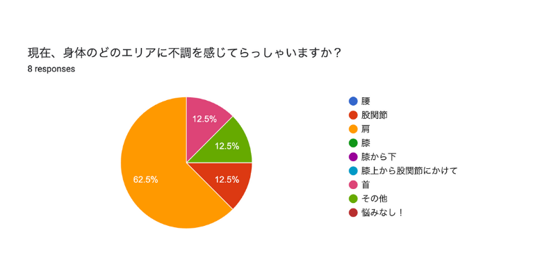 以下のグラフを見て分かる通り、半数以上のメンバーさんが気になるエリアが「肩まわり」!それに続いて首、股関節、膝というエリアが気になるとのことでした。